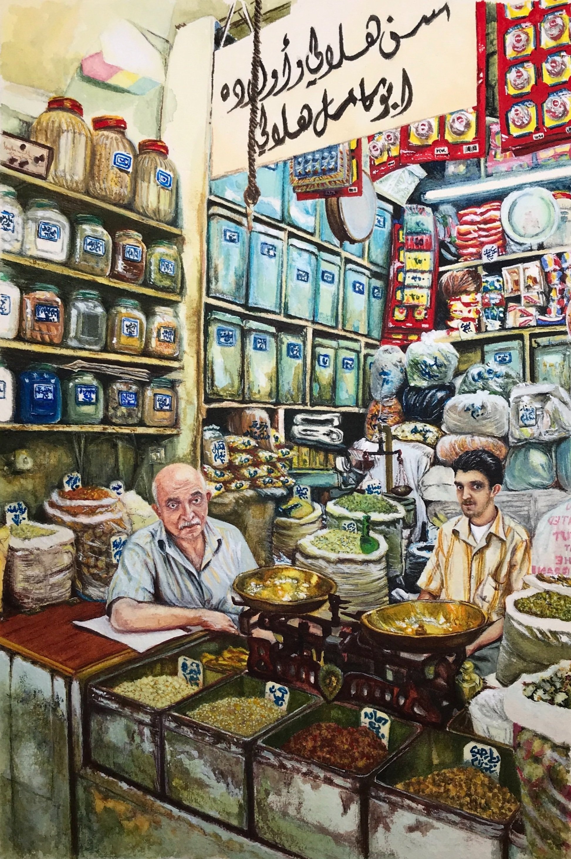 ‘Father & Son. And– “it’s all details.”’Watercolour on St. Cuthbert Mill’s Saunders Waterford paper. 13” x 11” unframed.